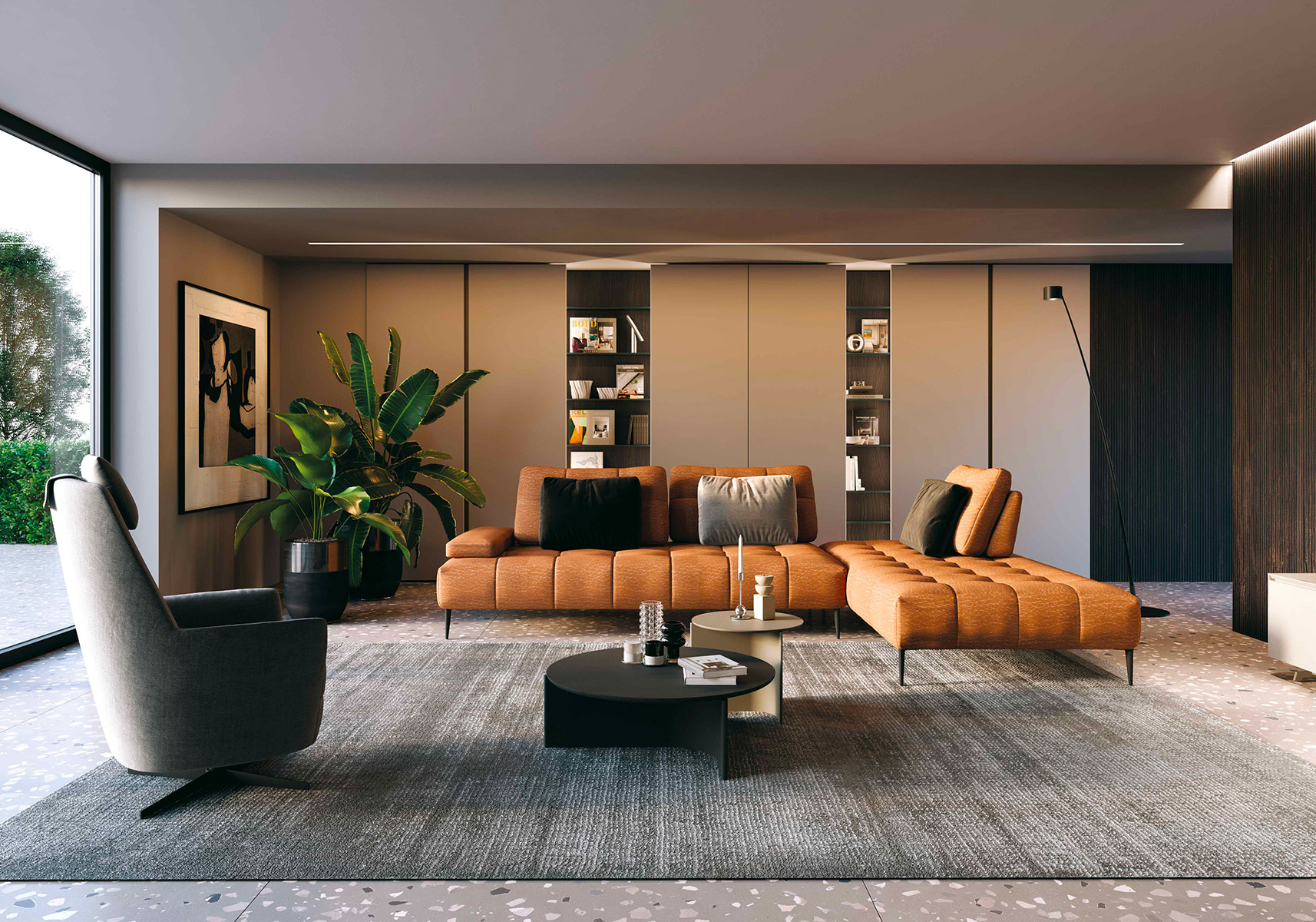 Il principale vantaggio del divano modulare è la libertà di personalizzazione: ogni composizione offre la possibilità di combinare sedute, elementi terminali, chaise longue, pouf e moduli contenitori per creare la soluzione su misura più adatta alle esigenze e agli spazi più disparati. Questa tipologia di divano offre inoltre un’elevata flessibilità progettuale in quanto consente di definire con precisione dimensioni, forma e funzionalità per ottimizzare anche gli spazi più complessi.