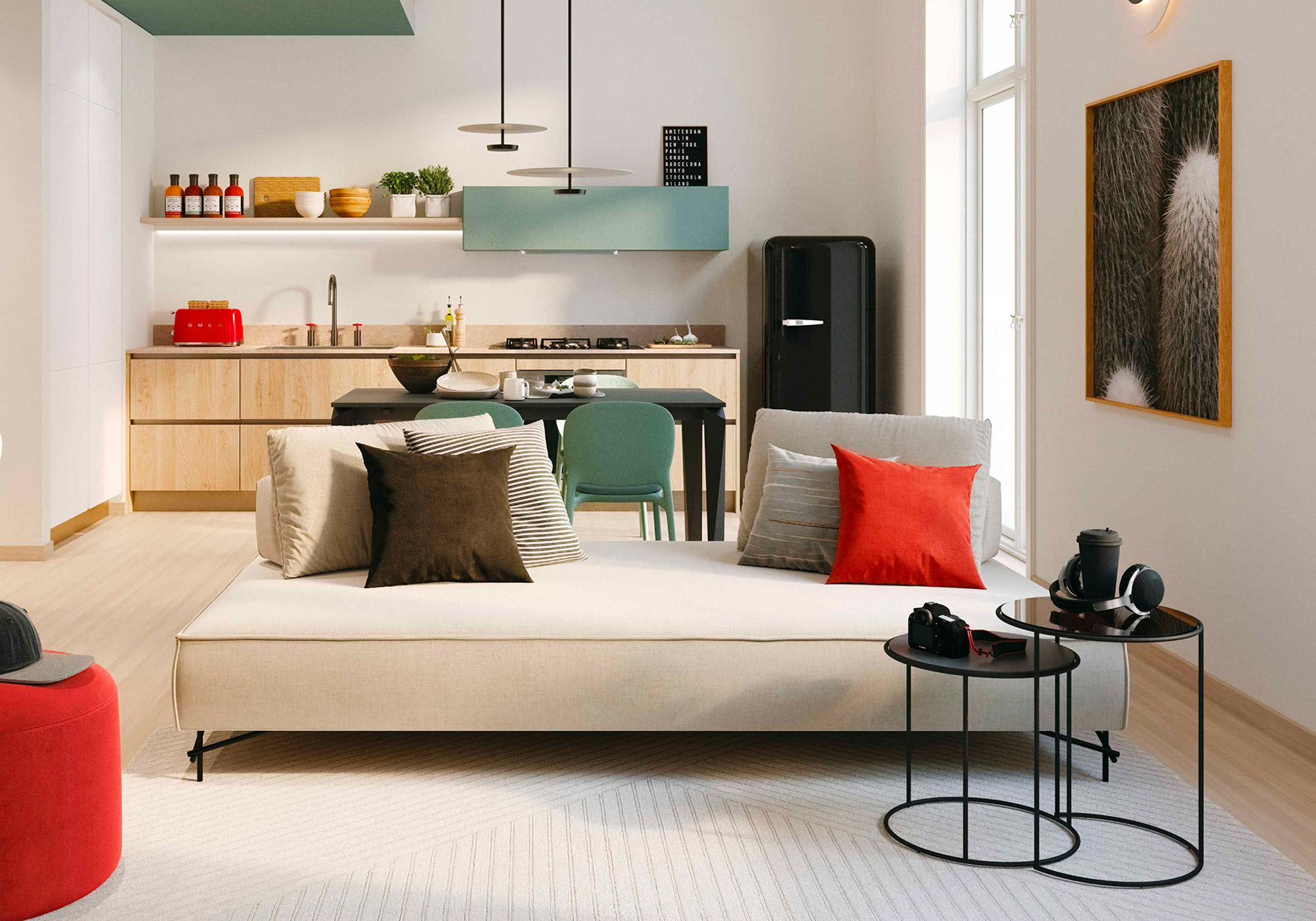 • lo spazio di passaggio: prendi le misure dello spazio che hai a disposizione e assicurati di mantenere aree libere intorno al divano per agevolare i movimenti, soprattutto se vuoi posizionarlo al centro della stanza;